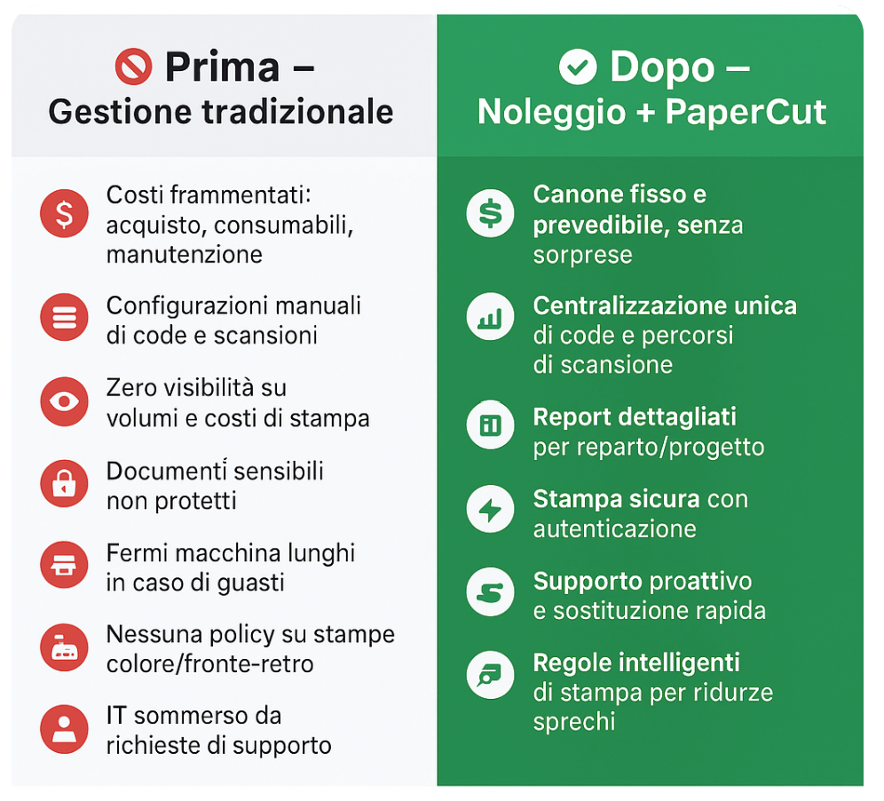 Con le nostre soluzioni di noleggio a lungo termine, integrate con PaperCut Software e sistemi avanzati di Document Management, ottieni finalmente controllo, efficienza e sicurezza.